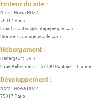 Merci de lire avec attention les différentes modalités d’utilisation du présent site avant d’y parcourir ses pages. En vous connectant sur ce site, vous acceptez sans réserve les présentes modalités. Aussi, conformément à l’article n°6 de la Loi n°2004-575 du 21 Juin 2004 pour la confiance dans l’économie numérique, les responsables du présent site www.vintagepeople.com sont :